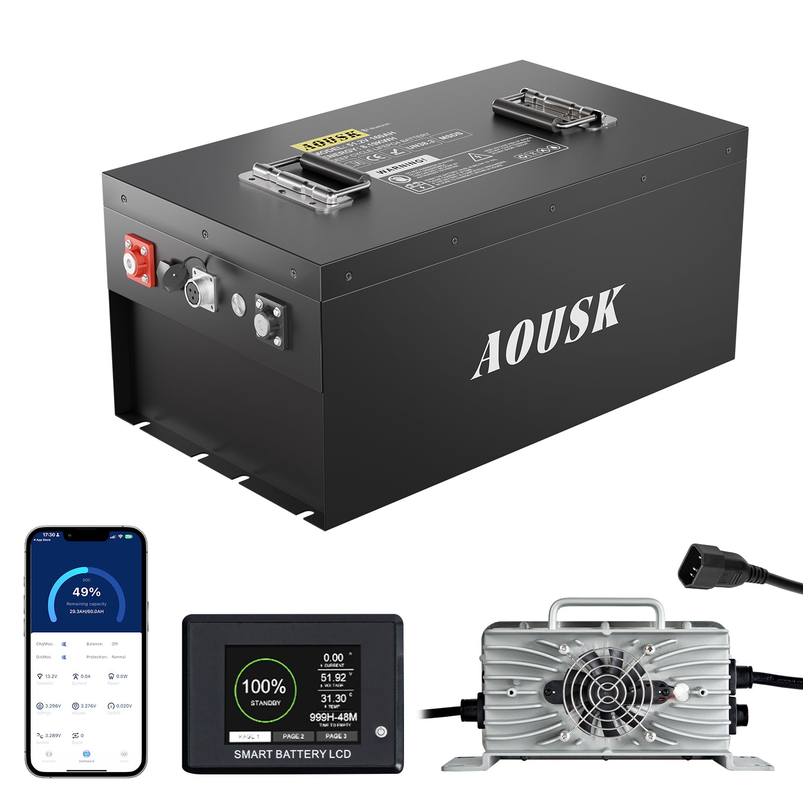 AOUSK 48V 160Ah Lithium Battery, MAX 10.24 kW Built-in 200A BMS with Touch Monitor & Mobile APP, 4000+ Cycles Rechargeable LiFePO4 Battery, Perfect for Golf Carts