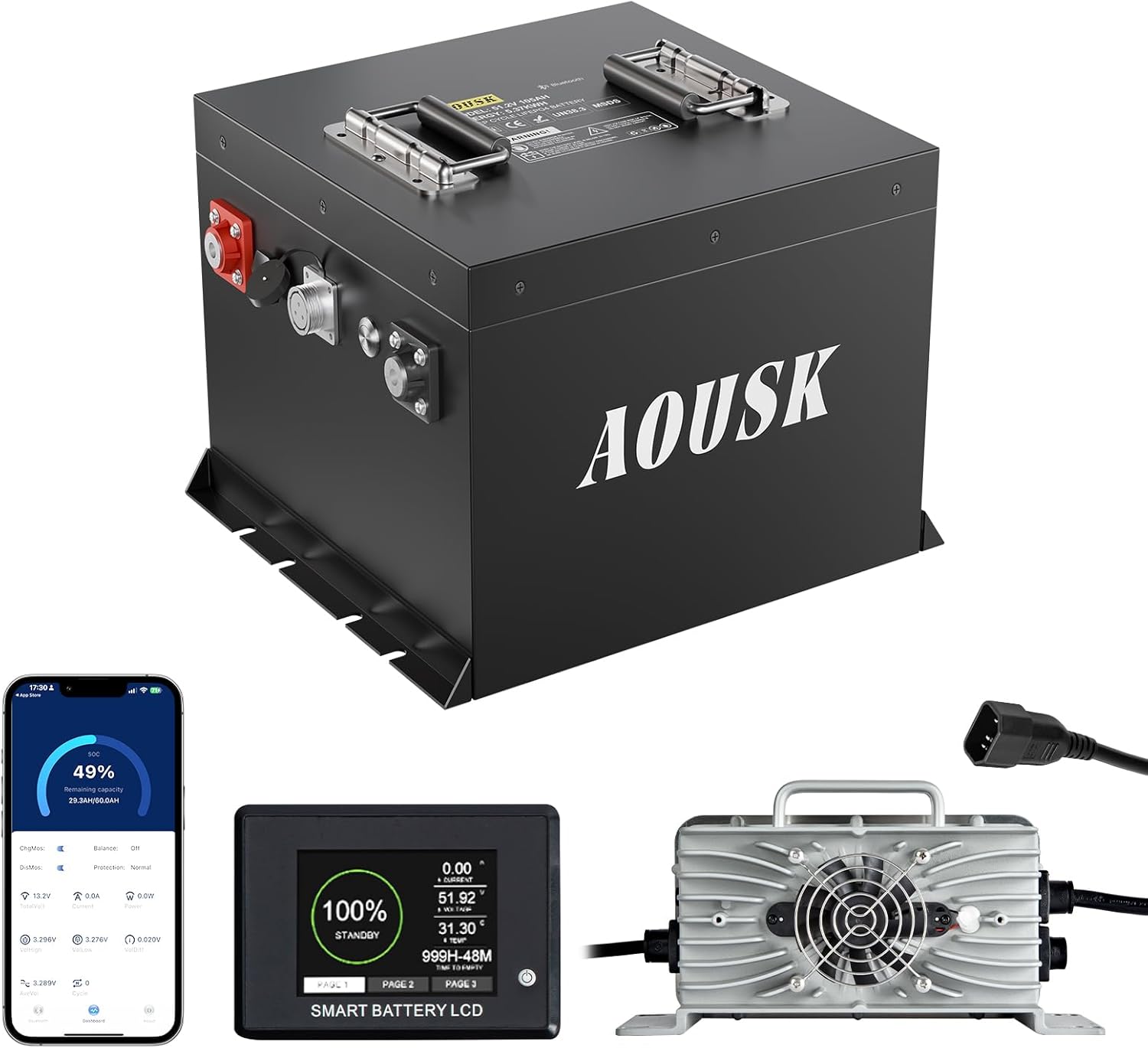 • Upgrade your golf cart or utility vehicle with the AOUSK Lithium 51V 105Ah LiFePO4 Battery Bundle. Get rid of your Lead-Acid or cheap lithium battery and replace it with known quality.